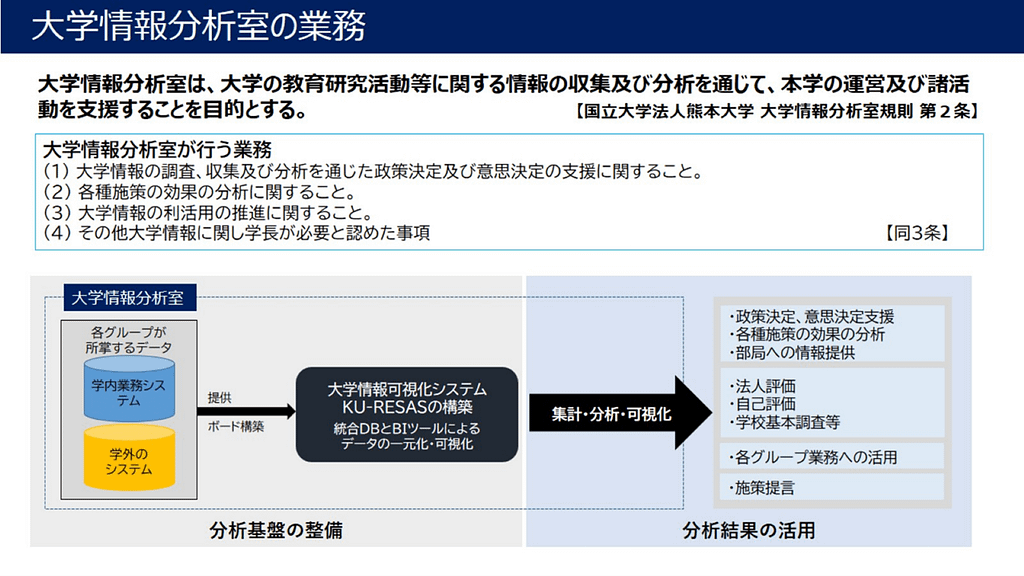 国立大学法人熊本大学大学情報分析室は、大学の教育研究活動等に関する情報の収集及び分析を通じて、大学情報を活かした本学の運営を支援することを目的とし、平成26年7月に設置されました。